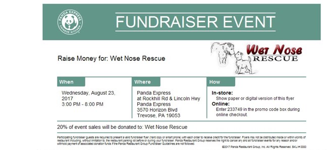 Please join us at Panda Express, located at 3570 Horizon Blvd, Feasterville Trevose, PA 19053. Come in between 3pm - 8pm for some food, showing the cashier the flyer on paper or on your phone, you can also order online to using the promo code listed on the flyer. Panda Express will donate 20% of the sales to Wet Nose Rescue!